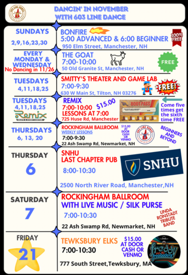 Kathleen and Kim were out on the dance floor, rarely taking breaks, and leading the group with high energy the entire night. We heard such great reviews from the guests attending and they all want 603 Line Dancing to come back real soon! Thank you Kathleen and Kim for giving it 100% out there so that everyone could learn a little and have a ton of fun while doing it.